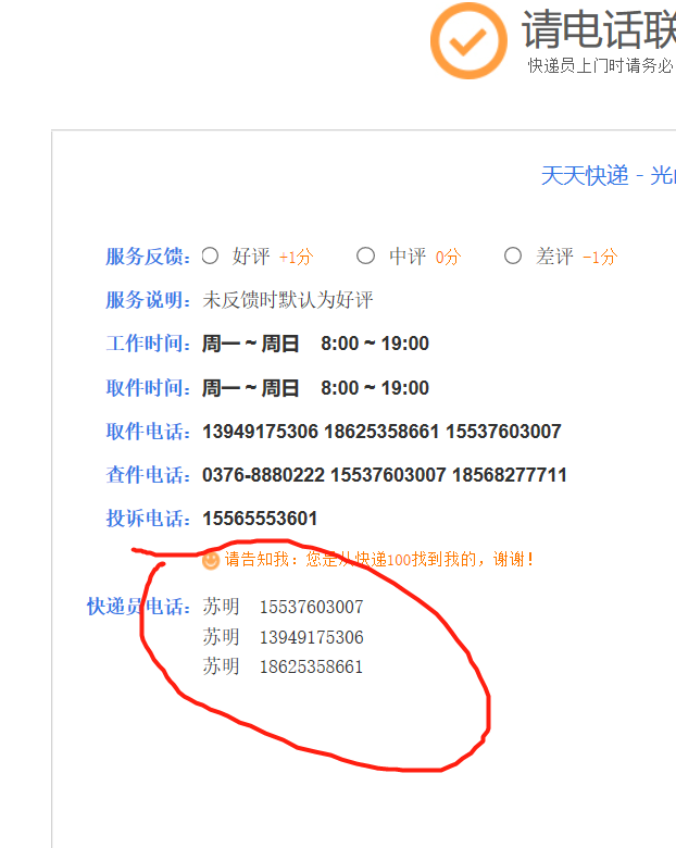 天天快遞公司光山分布的聯(lián)系方式有誤,15537603007這個手機號已換人,請刪除該信息,以免產(chǎn)生糾紛